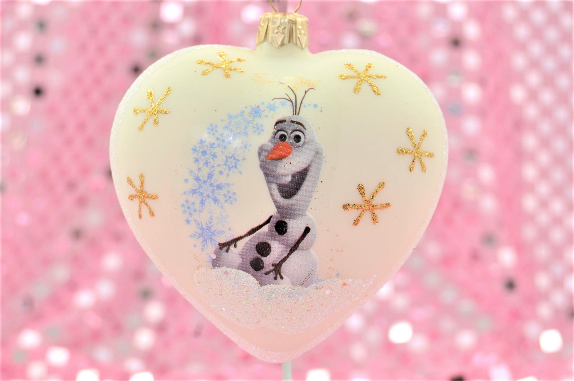 Bring some cheerful winter magic to your festive décor with this adorable Olaf Heart Christmas Ornament. Featuring everyone’s favourite snowman from Disney’s Frozen, this charming glass bauble captures Olaf’s joyful expression surrounded by delicate snowflakes and sparkling glitter details. The soft, frosty white background adds a gentle winter glow, making it perfect for children’s trees, themed decorating, or Frozen collectors.