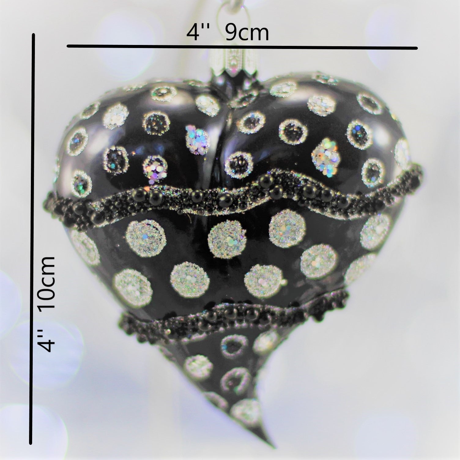 Elevate your festive décor with this striking Black Matte Heart Christmas Ornament featuring a bold contemporary design. Handcrafted by skilled artisans, each piece is mouth-blown from high-quality glass and decorated with shimmering silver glitter dots and intricate black beading. The matte finish adds a modern, luxurious touch, while the sparkling accents catch the light beautifully, creating a dazzling display on any Christmas tree.
