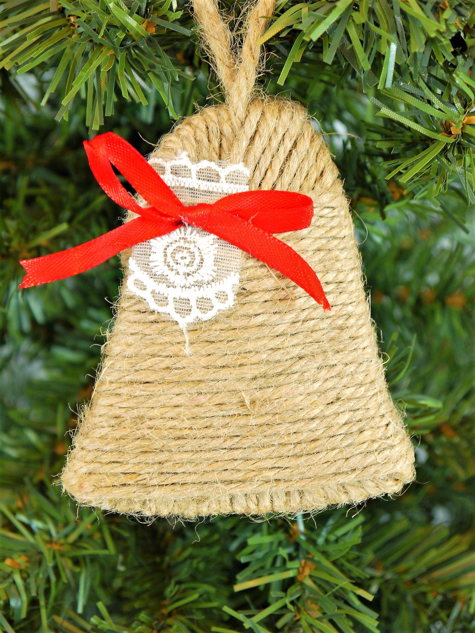 Rustic Jute Bell Christmas Ornament with Red Ribbon