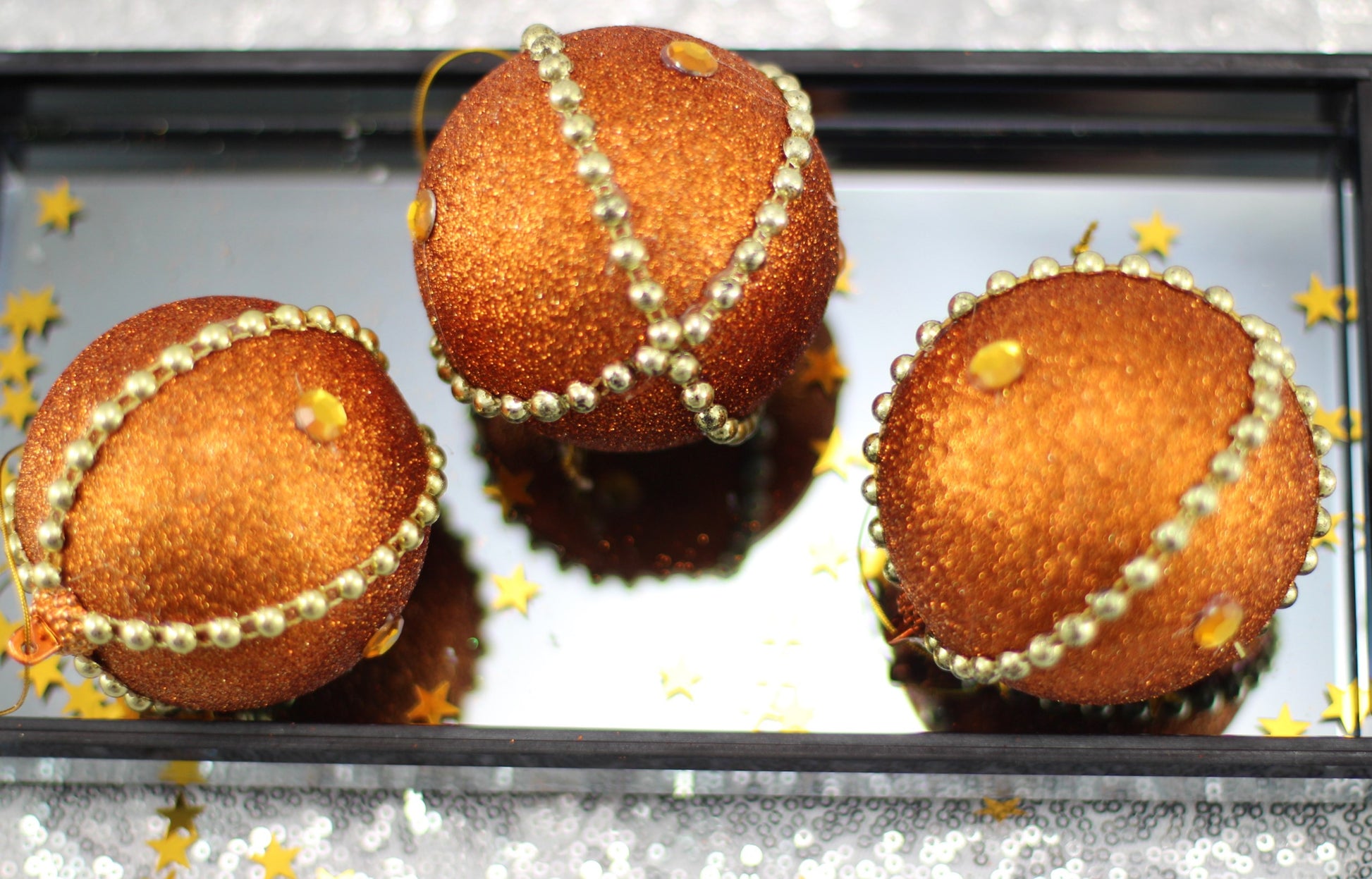 Set of 3 Round Christmas Baubles – Copper Gold Glitter With Beaded Chain And Crystals