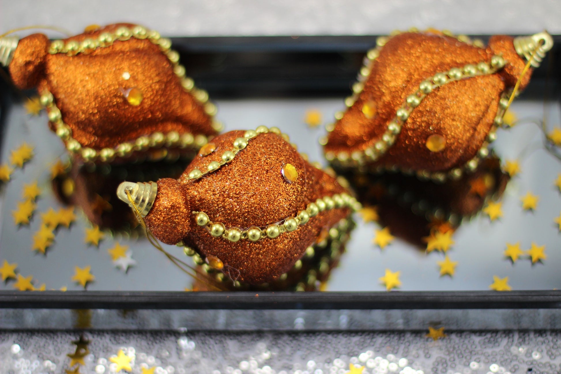 Set of 3 Christmas Icicle Baubles – Copper Gold Glitter With Beaded Chain And Crystals