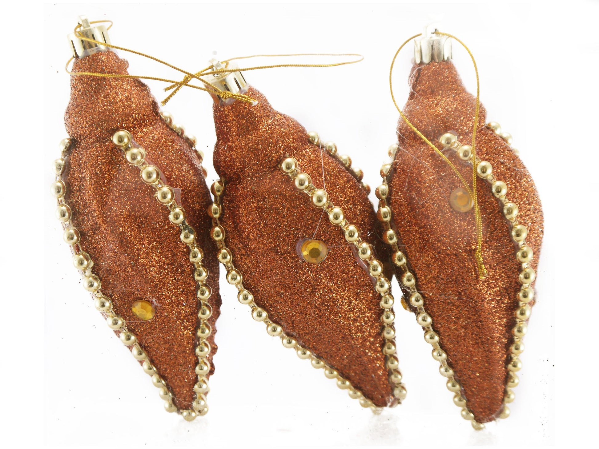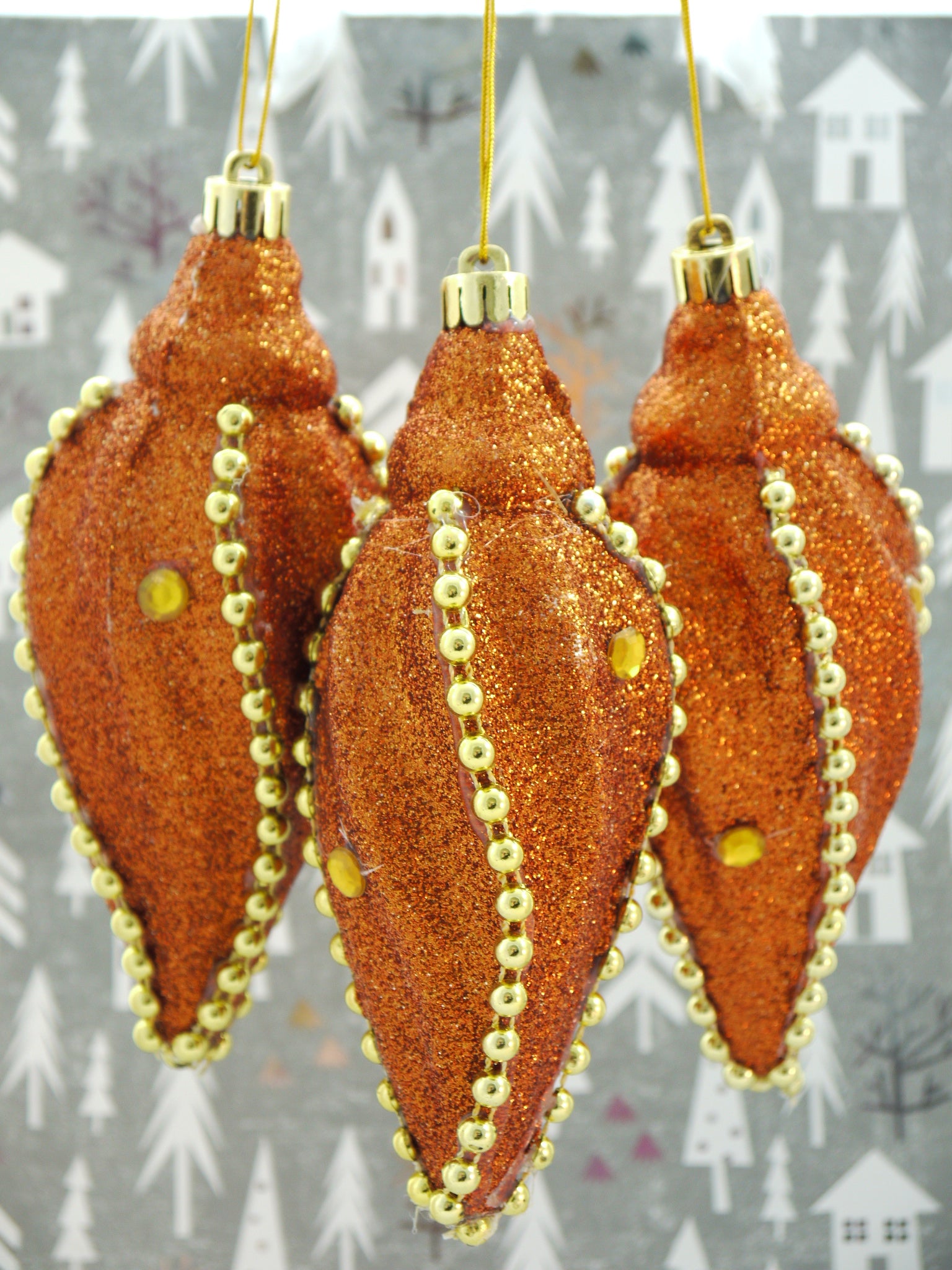 Set of 3 Large Christmas Icicle Baubles – Copper Gold Glitter With Beaded Chain And Crystals
