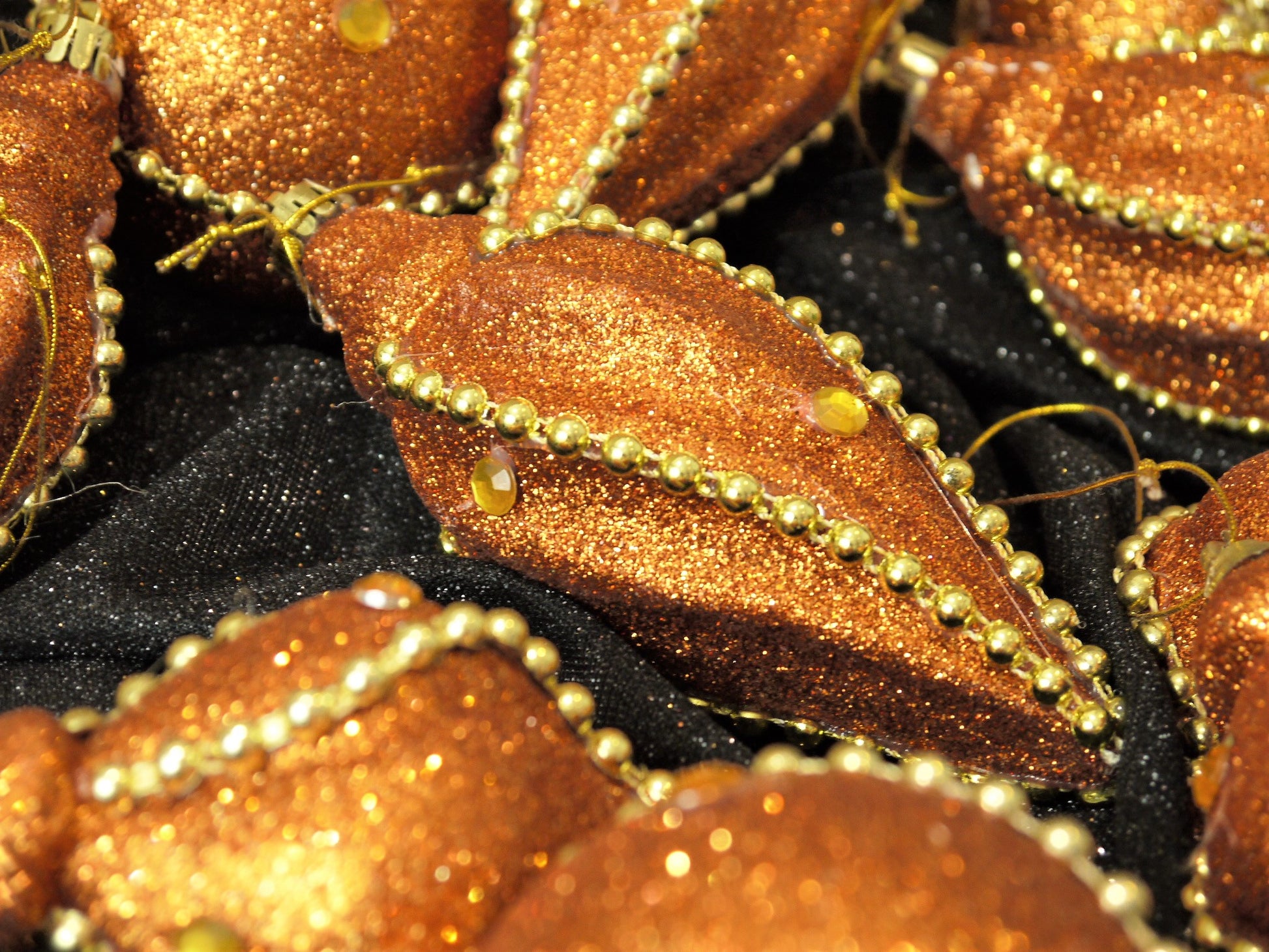 Color: Rich copper-gold with sparkling glitter and bead accents