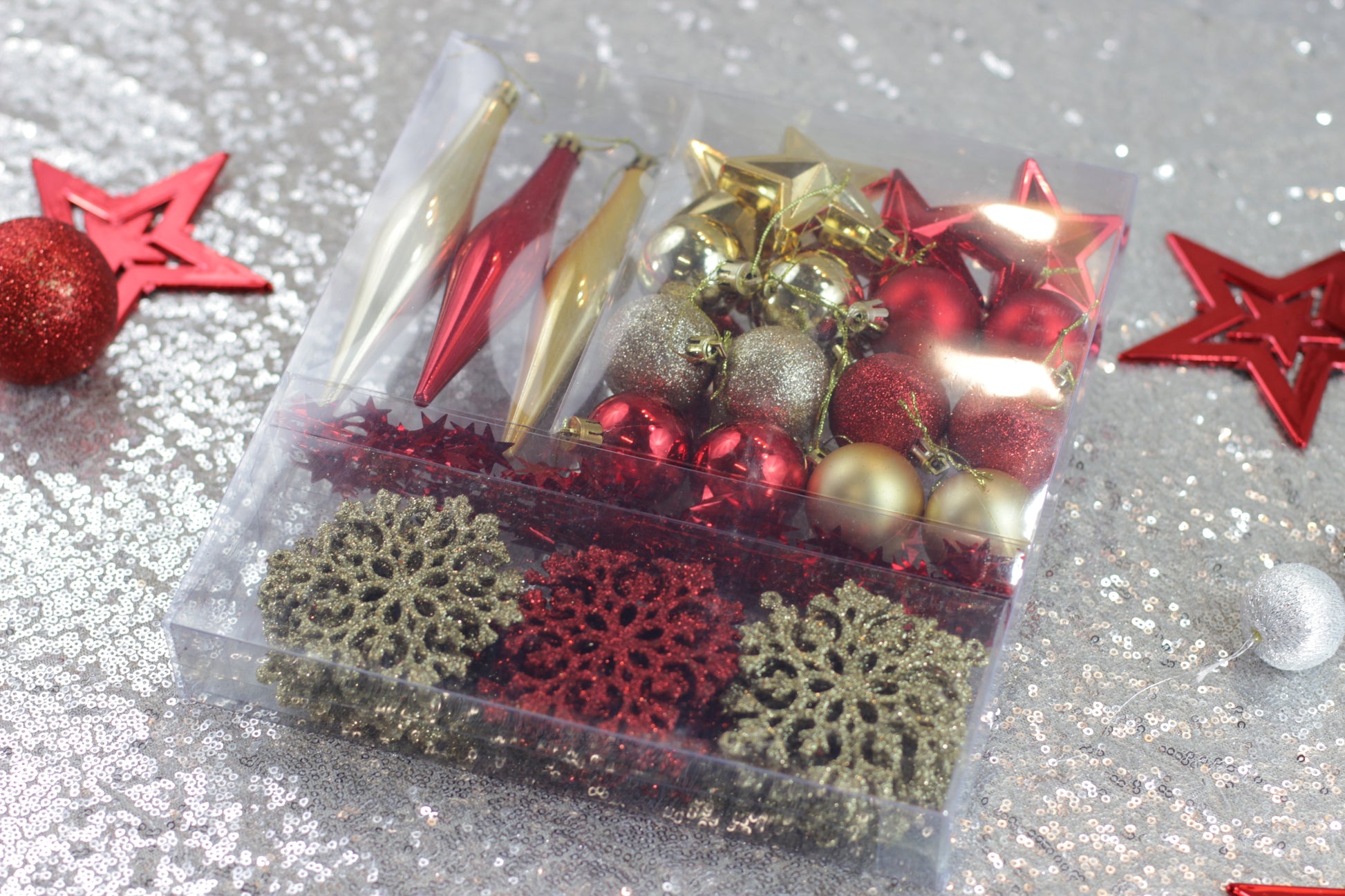 Transform your Christmas tree with this stunning 50-piece decoration set, perfect for creating a warm and festive look. This coordinated collection includes a variety of baubles, icicles, stars, tinsel, and glitter snowflakes — all in elegant shades of red and gold, designed to add both sparkle and sophistication to your holiday décor.