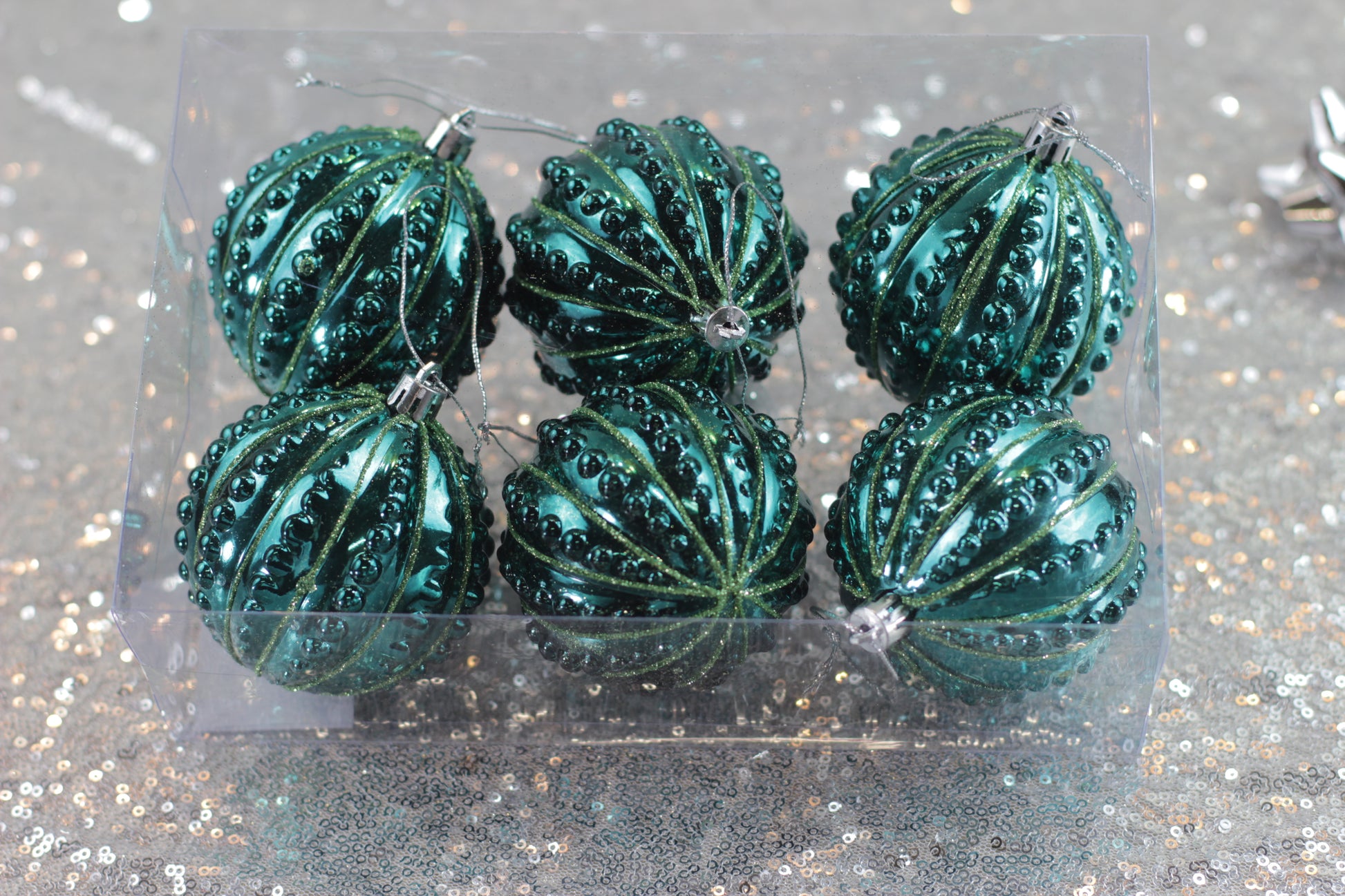 Bring a touch of modern elegance to your festive décor with this Assorted Set of 6 Shiny Peacock Green Baubles. Designed in a unique, funky shape, these baubles feature a stunning metallic peacock green finish with intricate textured detailing that beautifully reflects the light, adding depth and sparkle to your Christmas tree.