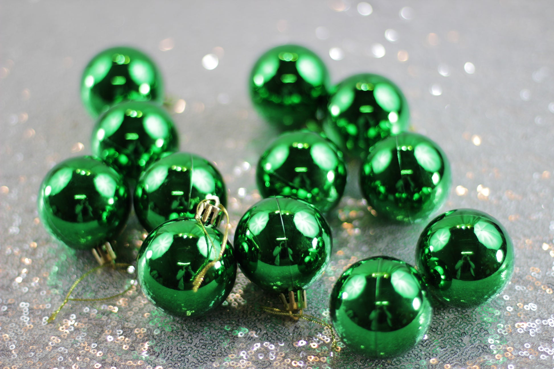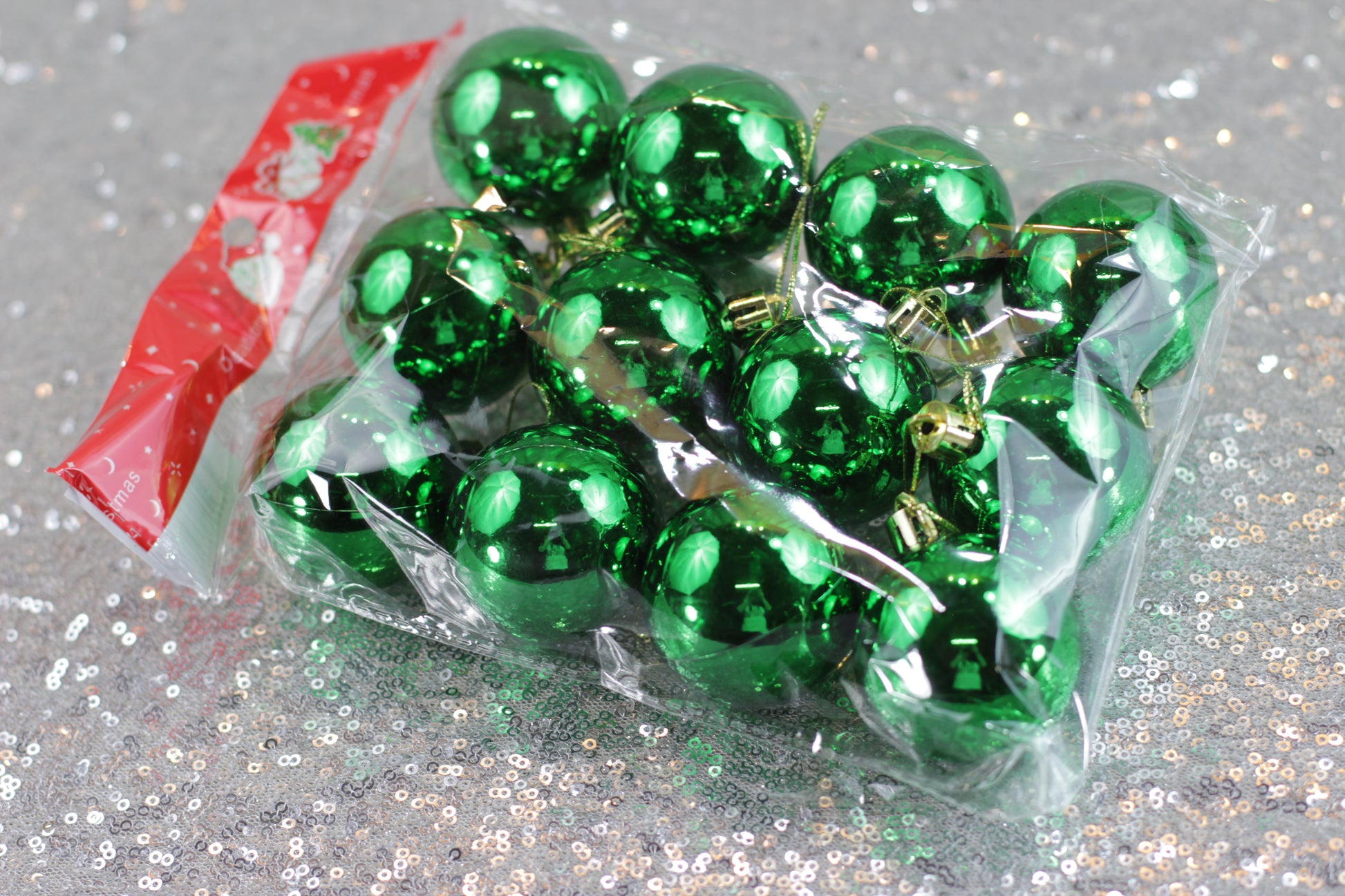 Bring classic festive charm to your holiday décor with this set of 12 Green Shiny Baubles. Each ornament measures 5cm (2") in diameter and features a sleek, reflective finish that beautifully catches the twinkle of your Christmas lights.