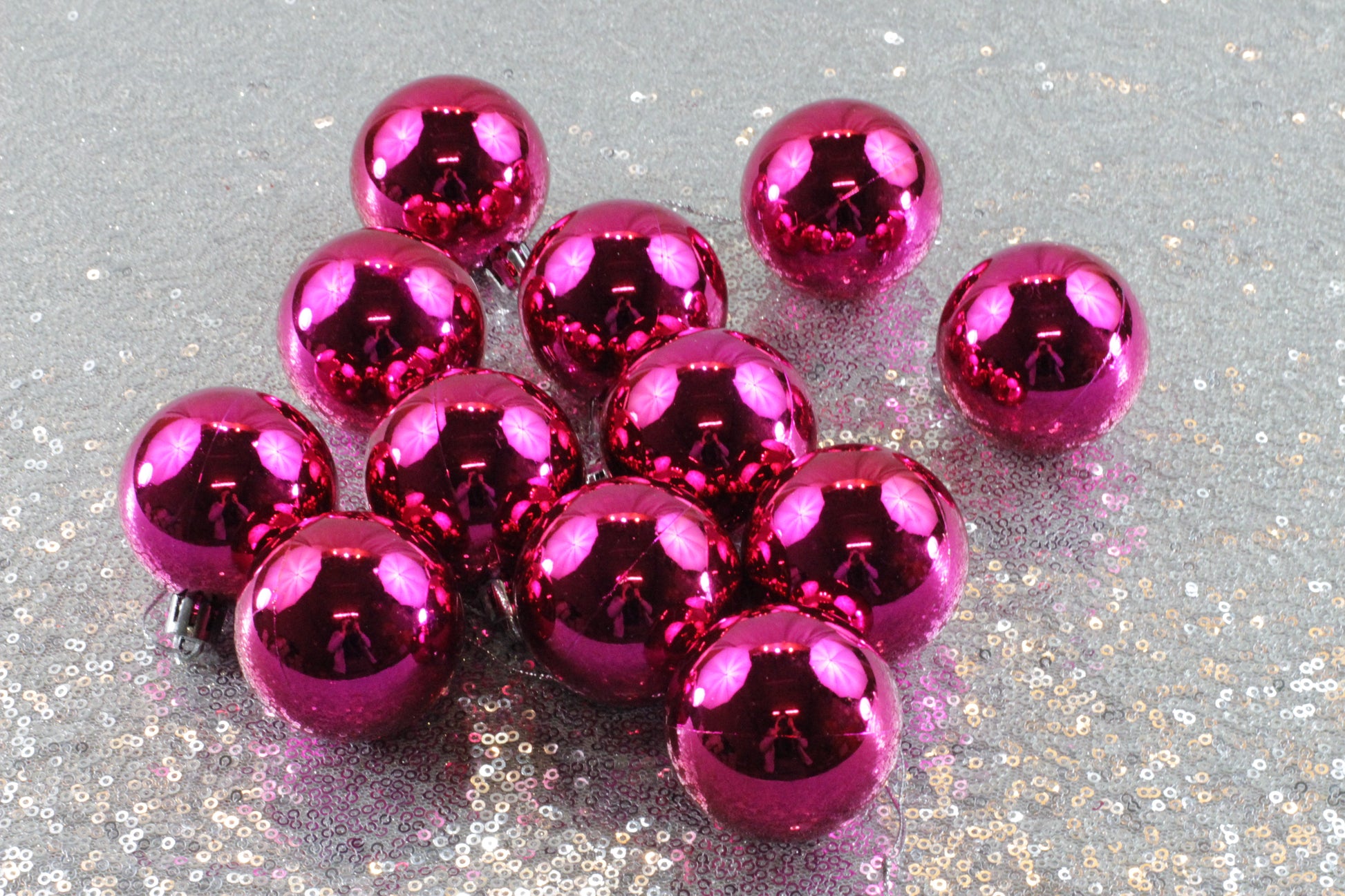 Add a touch of glamour and charm to your festive décor with this set of 12 Pink Shiny Baubles. Each bauble measures 5cm (2") in diameter and features a smooth, glossy finish that reflects light beautifully, creating a warm and elegant sparkle.